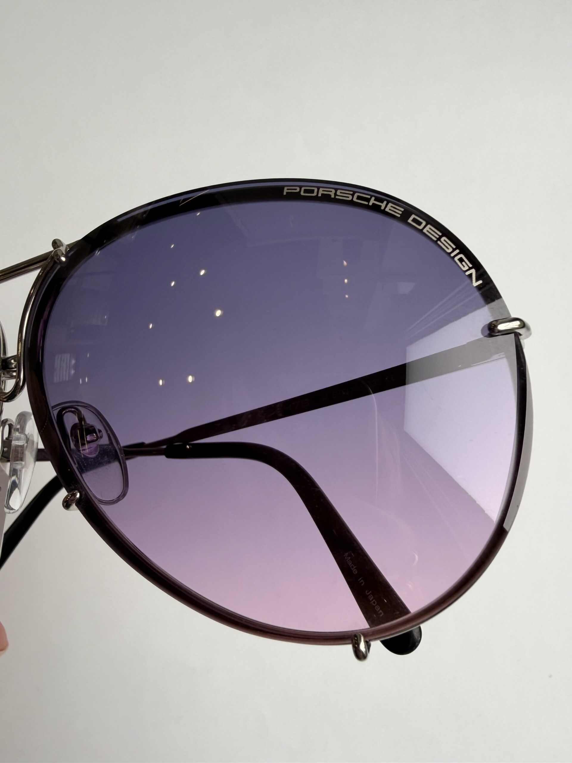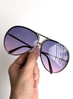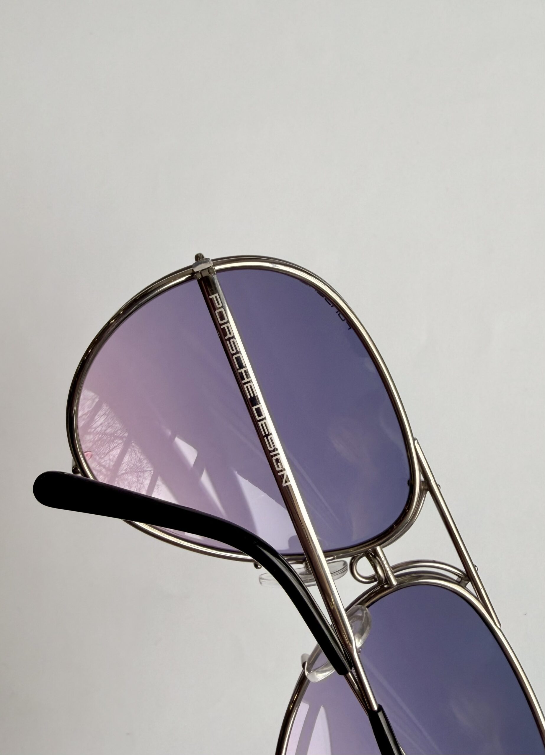 Okulary przeciwsłoneczne z kolekcji Porsche Design. Model z soczewkami w różowo fioletowym kolorze i oprawkami z metalu w kształcie pilotek najmodniejszym w tym sezonie. Filtr UV chroni wrażliwą tęczówkę przed promieniowaniem UVA I UVB. Do okularów dołączone etui, ściereczka do czyszczenia okularów oraz certyfikat autentyczności.